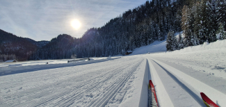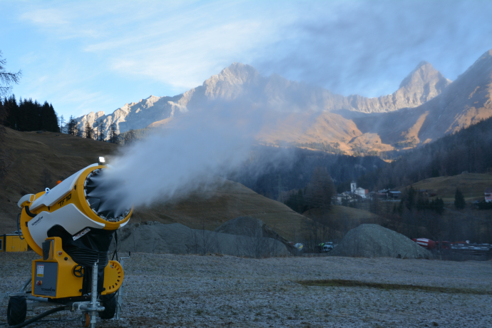Die Schneekanone befindet sich im neu errichteten Holzgebäude des Langlaufzentrums, das vor einem Jahr eröffnet worden ist. Die Infrastruktur besteht aus dem Unterstand der Pistenmaschine, einem Aufenthalts- und Wachsraum mit fliessend Wasser, 2 Toiletten und einem Kaffeeautomaten. Was noch fehlt, ist der Schnee, um die zehn Kilometer lange Loipe präparieren zu können.