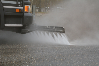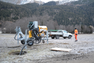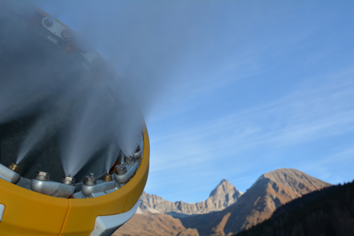 Jetzt kann der Test erfolgen. Die Maschine ruckelt und surrt und plötzlich spritzt es aus den Düsen. Noch sind die Temperaturen zu wenig kalt, um guten Schnee zu produzieren, aber der Test ist geglückt, die Maschine funktioniert einwandfrei.
