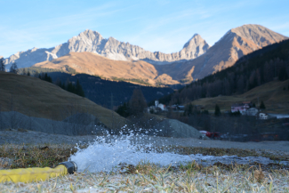 Die Männer rollen Schläuche aus und holen die schwere Maschine aus ihrem Sommerquartier. Zuerst muss die Leitung durchgeputzt werden. Das Wasser aus der nahegelegenen Gelgia muss klar und sauber fliessen, erst dann kann der dicke Schlauch an die Schneekanone angeschlossen werden.
