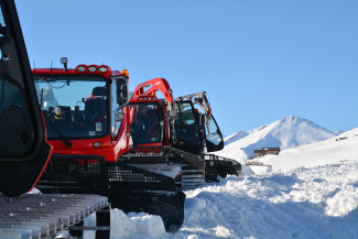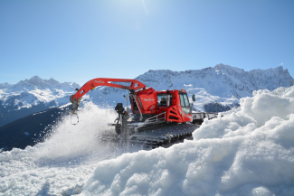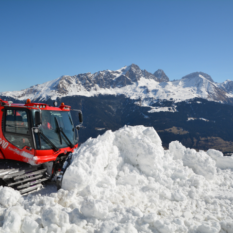 Die Pistenmaschinenfahrer haben zwei Aufgaben: Einerseits räumen sie Schnee von den Wanderwegen, «wir helfen der Sonne etwas bei ihrer Arbeit nach », schmunzeln sie. Andererseits häufen sie mit ihren tonnenschweren Raupenfahrzeugen ein grosses Schneedepot an. Von allen Seiten schaffen sie den schweren Schnee herbei und türmen diesen zu einem riesigen Haufen.