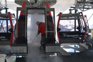 Die Bahnspezialisten kümmern sich derweil um die Gondeln. Jede der 48 Gondeln will bis in die letzte Ecke gründlich gereinigt werden. Es zischt und spritzt, wenn die Arbeiter die Gondeln mit dem Hochdruckreiniger bearbeiten. Und mit dem Dampfreiniger sorgen sie für schlierenfreie Scheiben und porenreine Polsterungen. 15 bis 20 Minuten wenden sie für jede Gondel auf. Denn im Sommer, wenn wieder Gäste drinsitzen, soll die Bergfrische schon in der Bahn zu riechen sein.