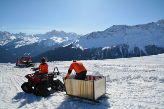 Später werden Sie das Schneedepot mit speziellen Vliestüchern abdecken. «Snowfarming nennt man dieses Verfahren,» erklären sie. «Wir können einen Teil des Schnees durch das Abdecken übersommern und im Herbst als Grundlage für den Snowpark in Somtgant und für die Pisten wieder benutzen.» Rund 60 Prozent des abgedeckten Schnees könne so übersommert werden.